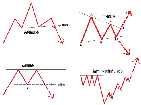 单个K线可反映出单日的价格强弱变化,但它不能准确地反映出价格在一段时间内的变化趋势。那么,对于一段时间的价格变化,我们不再利用K线的阴、阳、上、下影线进行判断,而利用K线连接后所形成的中长期型态再加以判断。K线的中长期基本型态有:头肩型(头肩顶、头肩底);双重顶(M头);双重底(W底),圆弧底(顶)形态等。