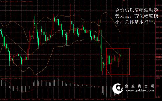 今日现货黄金开盘1269.82美元/盎司,截至北京时间下午17点30分,最高价格为1271.73美元/盎司,最低价格为1265.94美元/盎司。日内来看,金价仍以窄幅波动走势为主,变化幅度极小,总体基本持平。美元指数略微反弹变化也不大,消息面相对平行,技术面上看金价依然延续震荡走势。