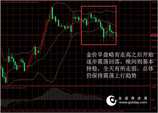 上一交易日现货黄金开盘1291.46美元/盎司,最高1293.04元/盎司,最低1285.88美元/盎司,收盘1288.21美元/盎司,收盘小幅下跌2.48美元,跌幅0.19%。日内来看,金价早盘略有走高之后开始逐步震荡回落,晚间则基本持稳,全天有所走弱,总体仍保持震荡上行趋势。美元指数继续走低,消息面变动不大,主要现货投资者仓位不变,技术面上看仍旧维持震荡上涨行的走势。