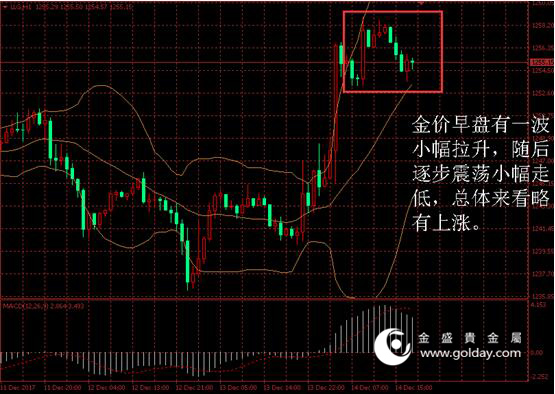 今日现货黄金开盘1255.27美元/盎司,截至北京时间下午18点00分,最高价格为1258.90美元/盎司,最低价格为1253.23美元/盎司。日内来看,金价早盘有一波小幅拉升,随后逐步震荡小幅走低,总体来看略有上涨。消息面上看较为平静,美元指数略有反弹,技术上看短期冲高遇阻,反弹暂时止步于1260美元下方。