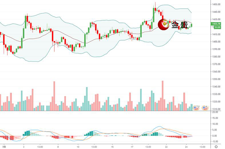现货黄金周三(7月24日)开盘于1417.38美元/盎司,盘中小幅上涨,涨幅0.18%。国际货币基金组织下调了今年第二次全球经济增长预期,这引发了对全球经济前景的担忧。黄金避险需求提升,止住了近期从高位回落的趋势。美元指数升至97.7的逾一个月高位,令持有其他货币的投资者购买黄金等美元计价资产的成本上升。