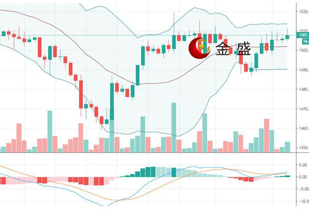 从日线图上来看,现货黄金整体处于高位震荡,技术面看黄金维持震荡上涨走势概率大,短线来看将继续震荡上行,策略上偏向于顺势看上涨。MACD也有金叉迹象,绿色动能柱不变;短线看涨信号有所增加。不过布林线中轨暂时仍对金价有所压制,而且均线交织,短线走势存在较大的变数;关注留意1487-1520区域突破情况。