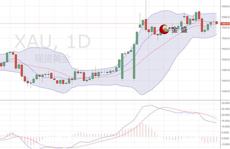 从日线图上来看,现货黄金昨日十字K线收平,整体区间不大。布林道开始收口,黄金围绕中轨附近上下纠缠,目前MACD死叉信号延续,绿能维持放量,加上昨日受阻于1580关口,暗示反弹动能减弱,金价面临重回跌势的风险,下方初步支撑关注1565附近,若失守该支撑,则将进一步看向1545附近支撑,上方关注1580附近阻力。