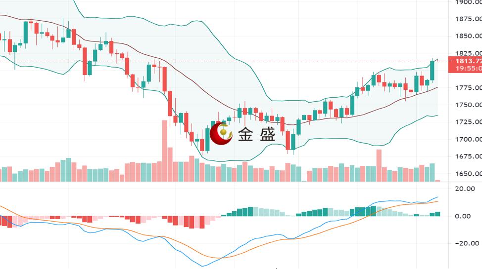 现货黄金上一交易日整体维持较为强劲单边上行走势,强势突破1800前期阻力,日线录得实体柱较为强劲阳线。布林带上轨向上开口运行,目前日线周期延续多头趋势,短线蓄势进一步冲高,后市仍有较大的上涨空间。操作上建议逢低做多为主,重点关注1800一线企稳状况,上方关注1820-1825区间阻力,下方关注1805-1800区间支撑。