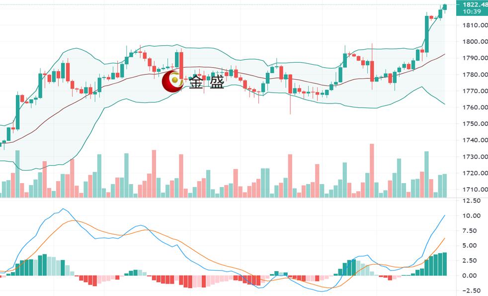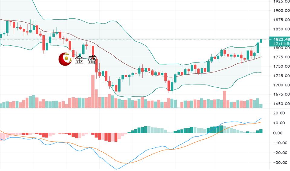 从四小时来看,现货黄金延续性上升,亚欧盘回调的空间有限,横向整理后再创新高,多头强势延续,回落继续多。目前K线在布林带上轨上方运行,布林带向上开口,均线向上排列,MACD二次开口向上,今日大概率延续隔夜的多头走势,黄金有望进一步走高,操作上建议回调做多为主,上方关注1830-1835区间阻力,下方关注1810-1805区间支撑。