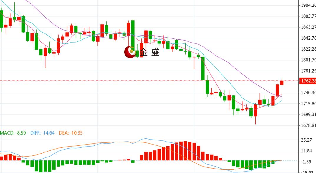 从四小时图来看,现货黄金上一交易日缓慢上行,不断走高刺破上轨刷新高,当前布林带处于开口期,MA均线三线向上,呈多头排列,MACD指标红色动能柱持续放量,快慢线金叉向上,综合来看,日内黄金上行完好,K线形态短线连阳上扬配合小阴线回踩修正,当前已突破重要阻力1760美元/盎司,操作思路上建议回撤做多,下方关注1740-1745附近支撑,进一步下行看向1725-1730区间支撑,目前技术面超买,切勿高位追多。