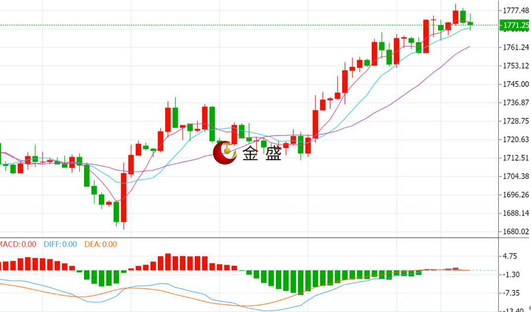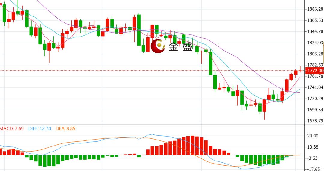 从四小时图来看,现货黄金上一交易日短暂跌破MA10日均线后回升,并持于高位横盘运行,当前布林带收口,MA均线向上延续,MACD指标绿色动能柱出现,快慢线粘合向前,日内黄金延续此前的上涨趋势,同时价格突破了前期阶段高点,多头有望进一步攻击下一个前期高点目标位,操作上回调低吸尝试做多为主。下方关注1755-1760区间支撑,日内重点关注上下突破情况,若上方刺破则在看千八附近关口,若下方突破则短期面临回调,上方关注1780-1785区间阻力。