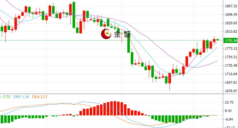 现货黄金上一交易日慢涨冲高,金价在触及1783水平后出现了快速上涨,最高触及1800附近徘徊,最终收阳。MACD金叉良好运行并有上破零轴的趋势,短期均线向上发散,金价短线偏向多头,上方阻力关注1805-1810区间,进一步上行看向1815附近阻力,一旦能顶破该阻力,则增加短线看涨信号,金价有望沿布林线上轨向上运行,下方支撑关注1785-1780区间,再次下破将打破多头形态,操作上考虑高空低多策略。