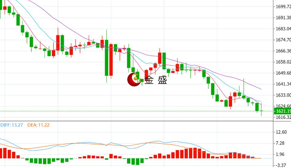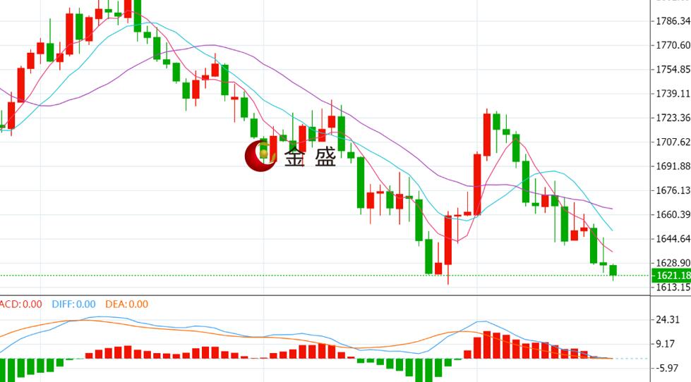 从四小时图来看,现货黄金上一交易日早盘新低后走震荡上行走势上涨,晚间刺破中轨后回落,并连阴下行,当前布林带开口向下,价格在反弹至中轨附近遇阻后快速回落,整体而言缺少反弹的动力,日内价格有继续走低的风险,MACD指标绿色动能柱持续放量,快慢线死叉向下,综合来看,黄金短期反弹力度较弱,操作思路上继续保持看空,上方关注1645-1650区间阻力,下方关注1620一线支撑。