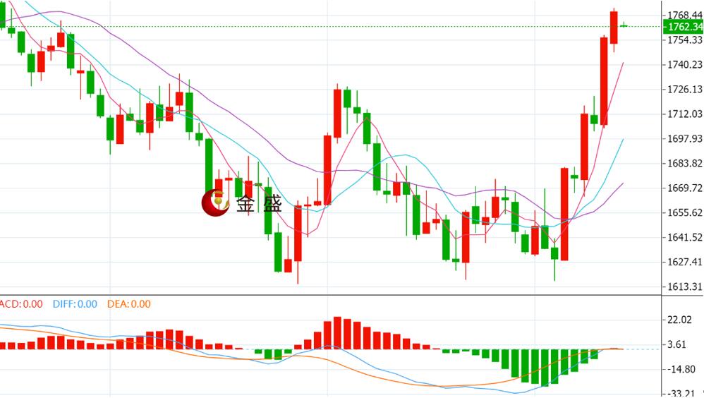 现货黄金上一交易日连续的大幅拉升彻底走出前期的宽幅震荡区间,随着上涨的延续,刷新了近三个月以来的新高至1772美元。布林带开口向上,价格在突破上轨阻力后依托上轨拉升,短线走势上大概率还有继续拉升的空间,日内需关注下方布林上轨1740附近支撑,预期价格小幅回调后继续走高,短线走势震荡偏多,操作思路上建议回调低多为主,上方关注1775-1780区间阻力,下方关注1750-1745区间支撑。