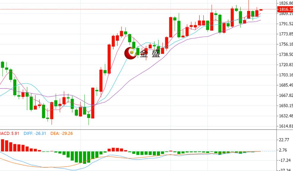 现货黄金上一交易日重新走高,最高触及1820附近,日图最终收阳线。黄金目前处于上行中正常修正,多头依旧占据优势,MACD指标快慢线在零轴上方现死叉,行情有望出现企稳上涨,操作思路上建议回调做多为主,反弹做空为辅,上方重点关注1820-1825区间阻力,进一步上行看向1830一线附近,下方关注1805-1800区间支撑,进一下行看向1790附近一线。
