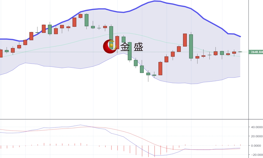 现货黄金上一交易日早盘开盘后区间波动,美盘开始前行情给出低点2632附近的位置后快速拉升,最高触及到了2657的位置后行情整理,还是没能摆脱震荡区间,最终再次收长影阳线。目前2655一线继续对盘面压制,金价近期持续震荡调整,MACD指标金叉,布林带收口,黄金窄幅震荡等待大数据指引,非农数据之前,延续震荡思路对待,上方关注2655-2665区间阻力,下方关注2630-2630区间支撑。