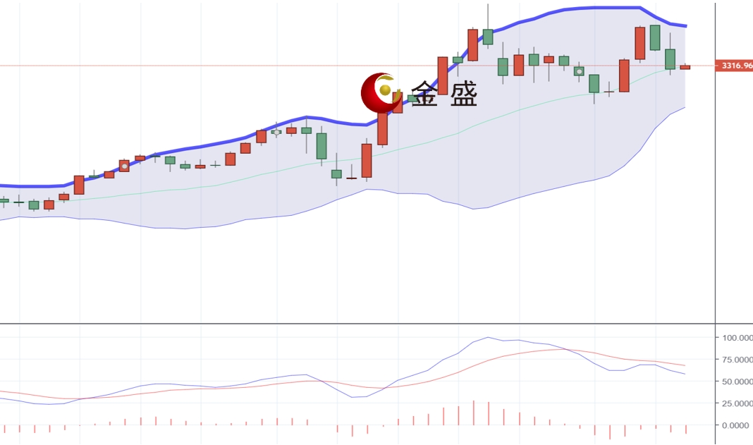 现货黄金上一交易日开盘直接拉升,最高触及到了3415附近位置后行情展开回落,跌破区间支撑后行情加速回落,最低触及3288附近后尾盘拉升,日线最终以一根上影线很长的大阴线收线,黄金冲高回落反弹无力,延续周三调整走势。 MACD指标死叉,有继续回落的风险;短期技术面显示多方力量衰减,走势存在调整可能。操作上建议逢高做空为主。上方关注3335-3345区间阻力,下方关注3280-3270区间支撑。