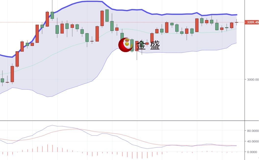 从日线图来看,现货黄金上一交易日晚间受消息面的影响快速冲高于3360附近后快速回落于3319一线后继续上冲,日K线报收中阳,今日黄金延续涨势,目前最高触及到了3377附近,布林带开口收窄,行情站稳在布林中轨之上高位震荡运行,MACD 指标双线在零轴上方死叉收口运行,空头动能减弱;整体来看,黄金多头偏强,关注后续突破方向。