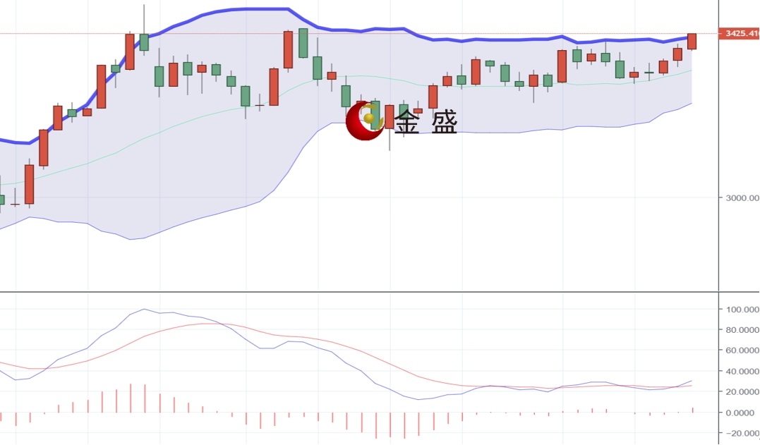 现货黄金上一交易日早盘高开后先拉升至3377的位置后行情快速回落,最低触及3338附近后行情受到基本面和技术支撑强势拉升,最高触及到了3398附近后行情整理,日线最终以一根下影线稍长于山影线的大阳线收线。黄金企稳日线布林带中轨反弹收涨,MACD指标金叉,短期技术面显示多方相对占优。布林带开口向上延伸,看涨前景加强,后市将有望进一步反弹走强,上方阻力关注3450-3450区间,下方关注3370-3360区间支撑。