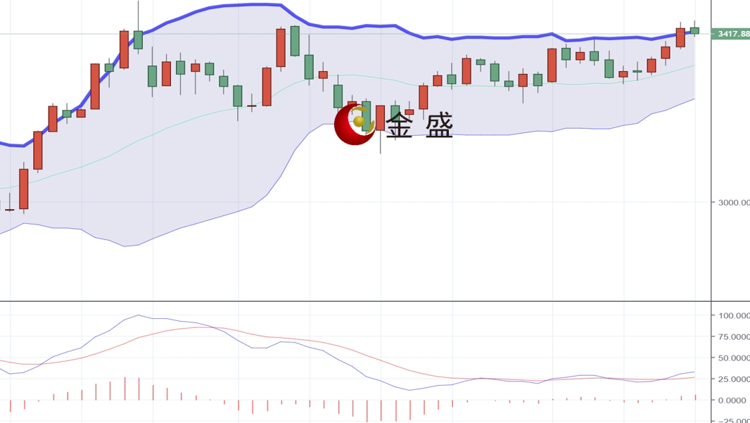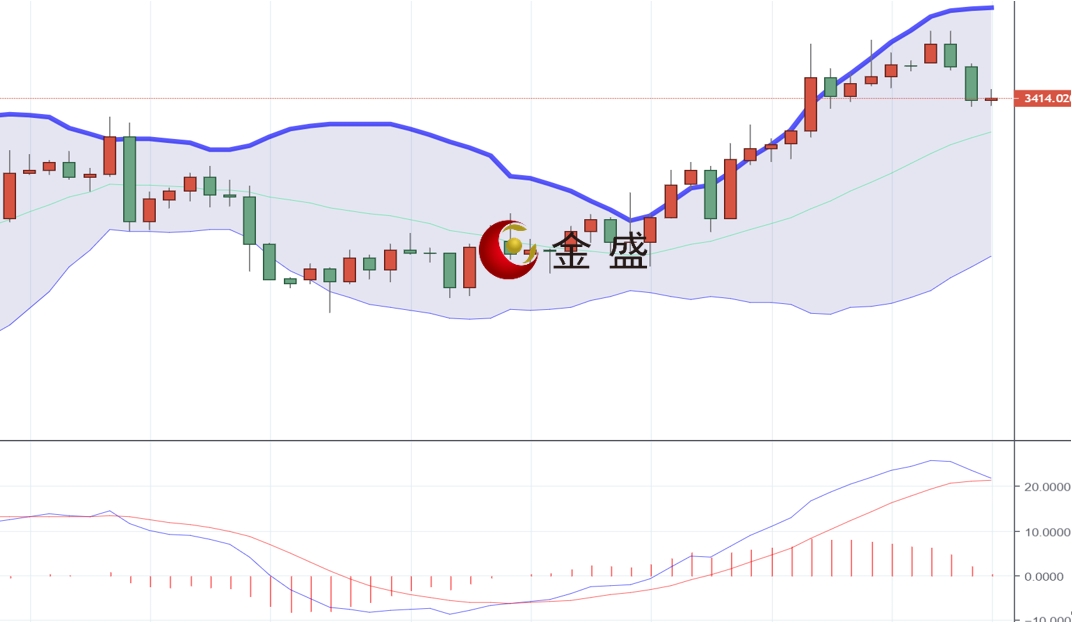 从日线图来看,现货黄金上一交易日亚盘因中东问题避险早盘冲高3445后探底承压开始回踩,回踩3408附近后企稳欧盘维持小区间震荡,美盘创高3346后继继续承压开始震荡。日线呈前进三兵,站上日线布林上轨,今日早盘高开上阵3352日线通道上轨后开始承压,结合近期基本面及地缘局势升温影响,依旧给多头提供有效动力,但不能盲目追涨,操作上以回落做多为主。
