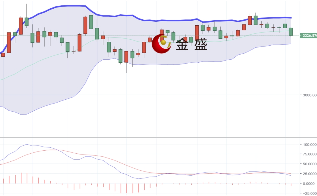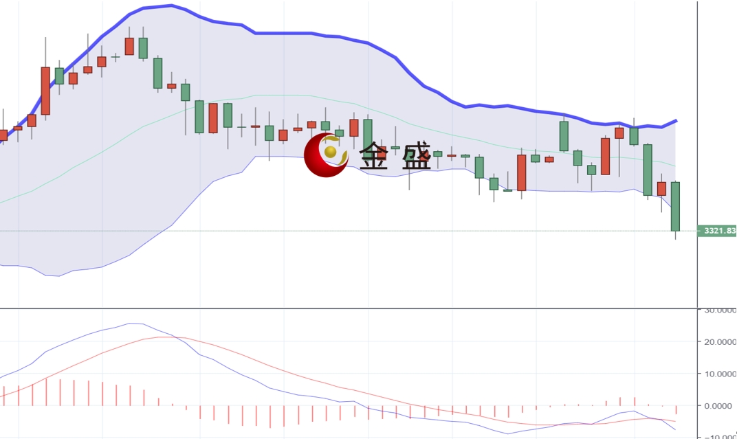 从日线图来看,现货黄金上一交易日早盘高开上涨至3396附近开启下跌,午后最低下跌至3346一线开启反弹,晚间美盘又回到3393附近一线,受地缘避险缓和影响,收盘再次回落,最终日线收阴且带长下影线。今日开盘黄金持续下跌,截止目前为止已下跌至3315一线,黄金从两个月高位遇阻回落,跌势在本周得到延续,短期表现明显偏弱。