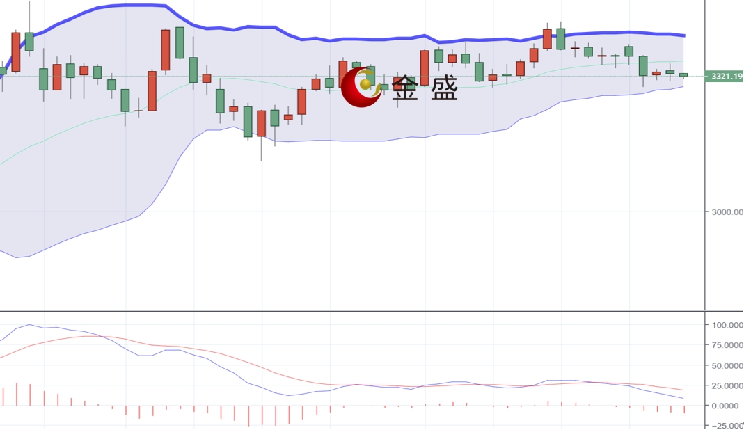 现货黄金上一交易日小幅回踩最低触及3329美元一线企稳拉升,欧盘最高拉升触及到了3350美元一线回落,美盘进一步下跌,最低触及到了3309美元一线,尾盘有所反弹,日线以一根上下影线等长的纺锤形态收线,黄金近期持续偏弱震荡调整,运行在中轨及短期均线下方,MACD指标快慢线零轴上方现死叉,做空的动能为主,短期呈现震荡偏弱的行情走势,操作上建议高空为主。上方关注3340-3350区间阻力,下方关注3310-3300区间支撑。