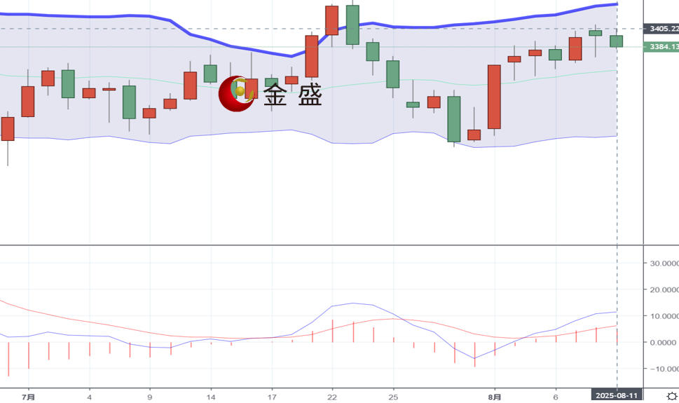 现货黄金上周五在3400美元大关附近窄幅震荡,接近收平,关税政策的不确定性、美联储降息预期的升温,仍给金价提供支撑。截至目前,现货黄金仍在3400关口附近徘徊,最高触及3408.34美元/盎司,最低至3384.23美元/盎司。美俄寻求达成俄乌停火协议,特朗普称美俄在乌克兰问题上已“非常接近”达成协议,美俄领导人将于 8 月 15 日会晤,市场风险偏好有所提升,同时贵金属面临潜在压力。