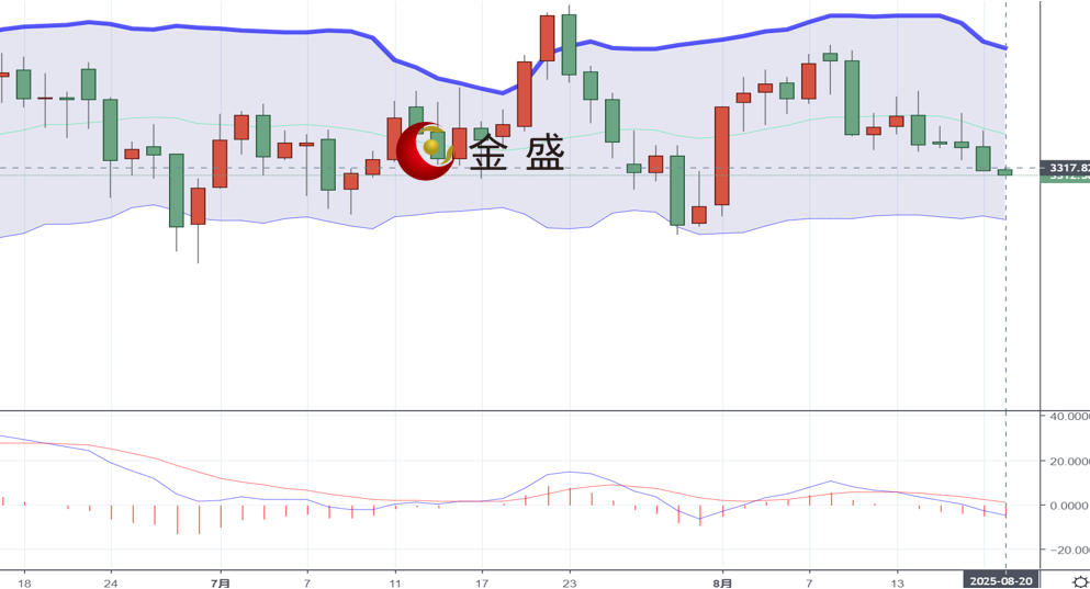 现货黄金上一交易日亚欧盘持续区间震荡,晚盘震荡反弹最高触及到了3345美元一线受阻下跌,最低触及到了3314美元一线,尾盘弱势收尾,日线最终以一根上影线很长的中阴线收线。随机指标死叉向下,主空信号;黄金近日连阴下跌,持续运行在中轨下方,短期均线空头排列,价格或延续跌势,操作思路上建议反弹做空为主,上方关注3330-3340区间阻力,下方关注3310-3300区间支撑。