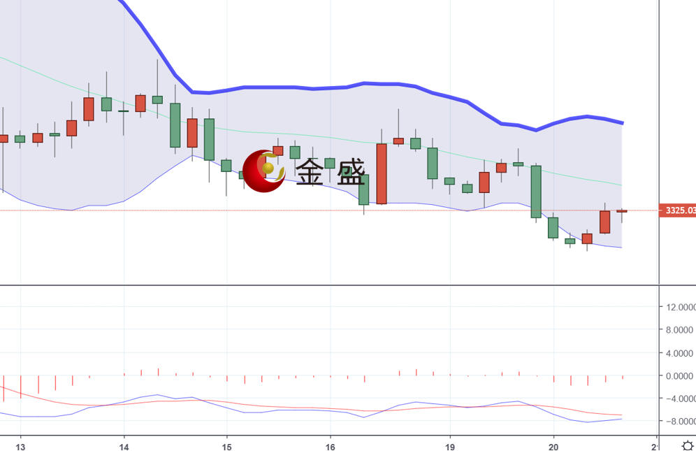从日线图来看,现货黄金上一交易日午后最高反抽触及到3345一线后承压回撤,美盘下跌至3314附近后暂时止步,日线大阴继续下滑,日线收于4连阴。黄金延续震荡下行格局,高点、低点逐渐走低,均线空头排列,指标MACD死叉放量运行,空头动能增强。布林带三轨收口,目前黄金震荡下跌最低触及至3311美元附近,下方3300美元是重要的心理关口和技术支撑,若能守住,可能引发反弹;若有效下破,则可能打开更大的下行空间。