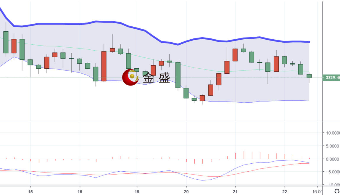 从日线图来看,现货黄金上一交易日亚欧盘承压3350关口持续走弱,最低触及到3325附近企稳反抽,晚间美盘二次反抽承压3348关口回落震荡收盘,日线以下影小阴线收盘。昨日金价并未延续反弹上行破高,再度回到多空震荡3350-3320区间内运行。今日早间延续小幅下挫,目前已经开始破位3330一线,布林带持续横向运行,日内短周期走势上没有特别明显的趋势,继续震荡为主;今日周五交易需谨慎,区间未破位前高空低多为主。