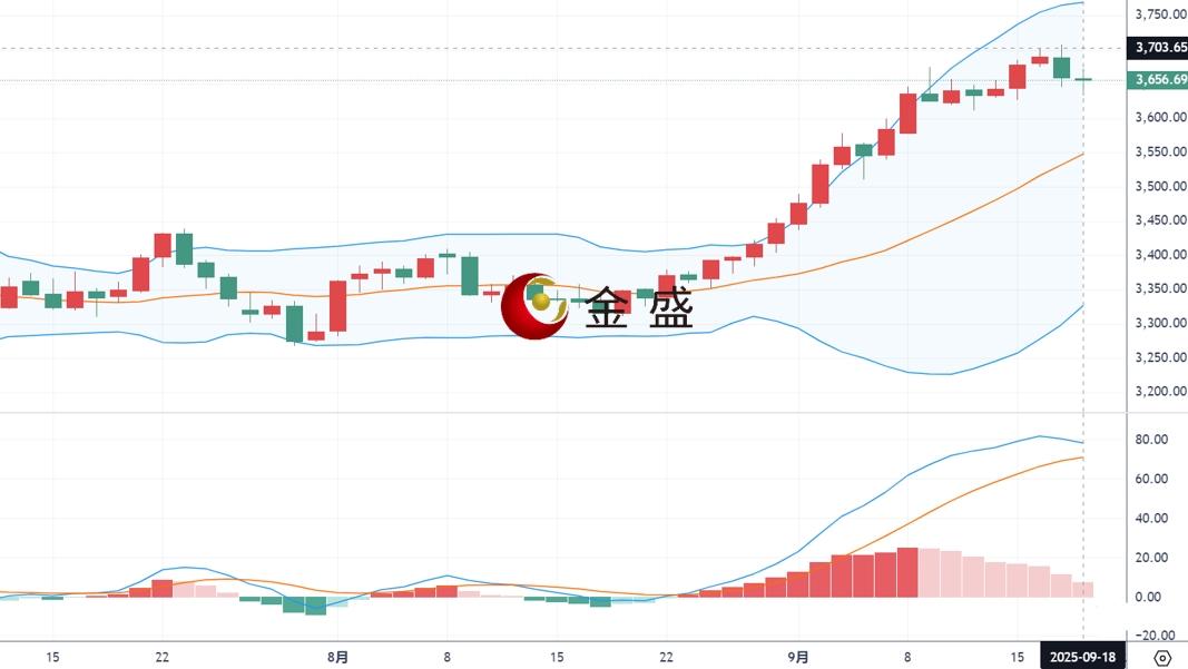 从日线图来看,现货黄金上一交易日凌晨在美联储降息影响下迎来多空宽幅震荡运行,整体金价向下回落测试3650关口并迎来迅速回升,最终加速上行冲高刺破3707关口后大幅回落震荡收盘,日k线报收冲高回落震荡中阴,整体金价在3710一线关口附近出现压制调整形态,打破了前两日多头强势的格局;整体多头趋势未改,但短期存在调整压力。