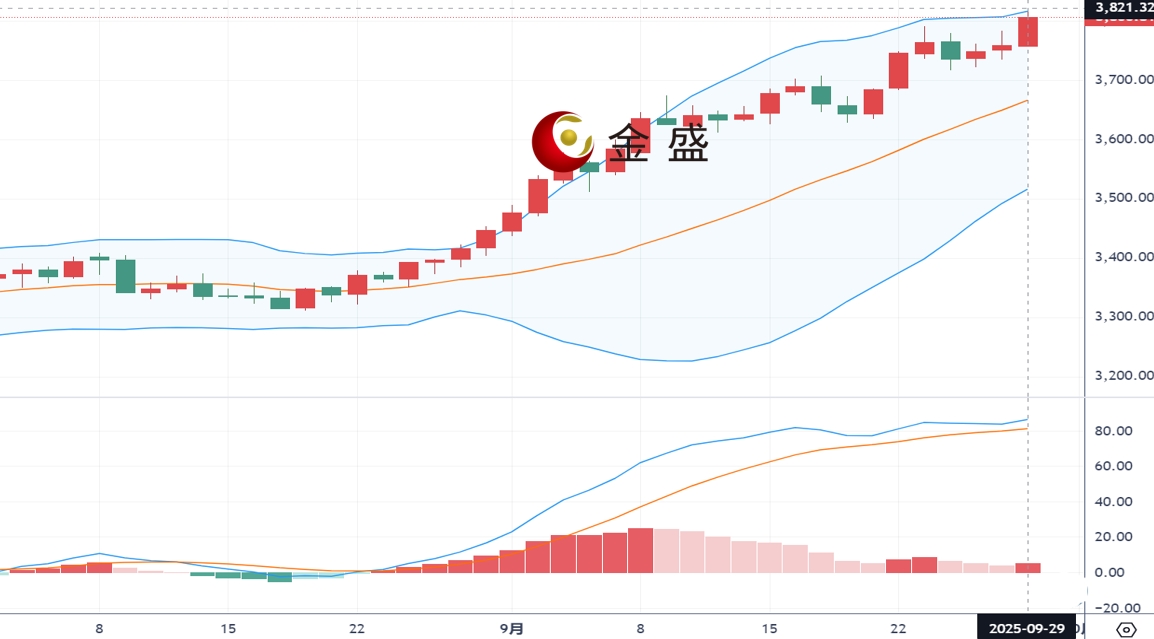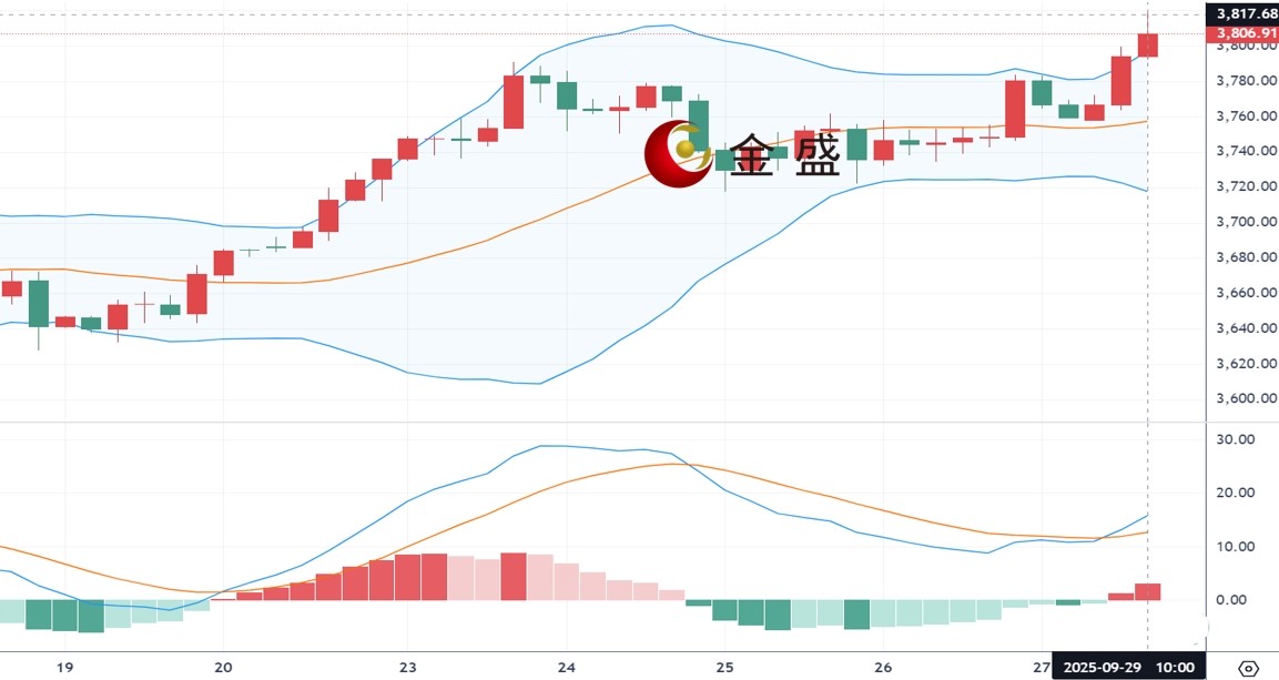 从日线图来看,现货黄金上一交易日总体呈现上涨的状态,价格最高上涨至3783附近,日线录小幅阳线。今日黄金早盘低开之后继续向上发力,首次突破每盎司3800美元心理关口,最高触及3820一线。黄金阶梯式上涨,高位逐渐走高,当前价格在历史高位附近运行,市场普遍情绪看涨,操作上建议回落做多为主,警惕冲高回落风险。