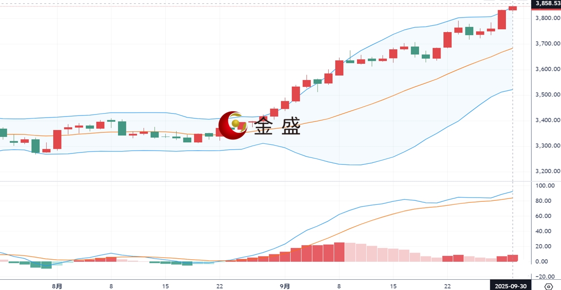 现货黄金上一交易日早盘回踩3757附近企稳迅速走高,最高触及到了3834附近后震荡盘整,日线最终以一根略带影线的饱和大阳线收线.黄金强势反弹拉升并站上3800美元关口,买盘增强,并且受美国政府可能关门的影响,以及美联储降息预期的推动,多头力量增强,布林带也再度向上延伸,短期走势上依旧没有看到见顶的迹象,继续等待历史高点的刷新,操作上建议回落继续做多为主。