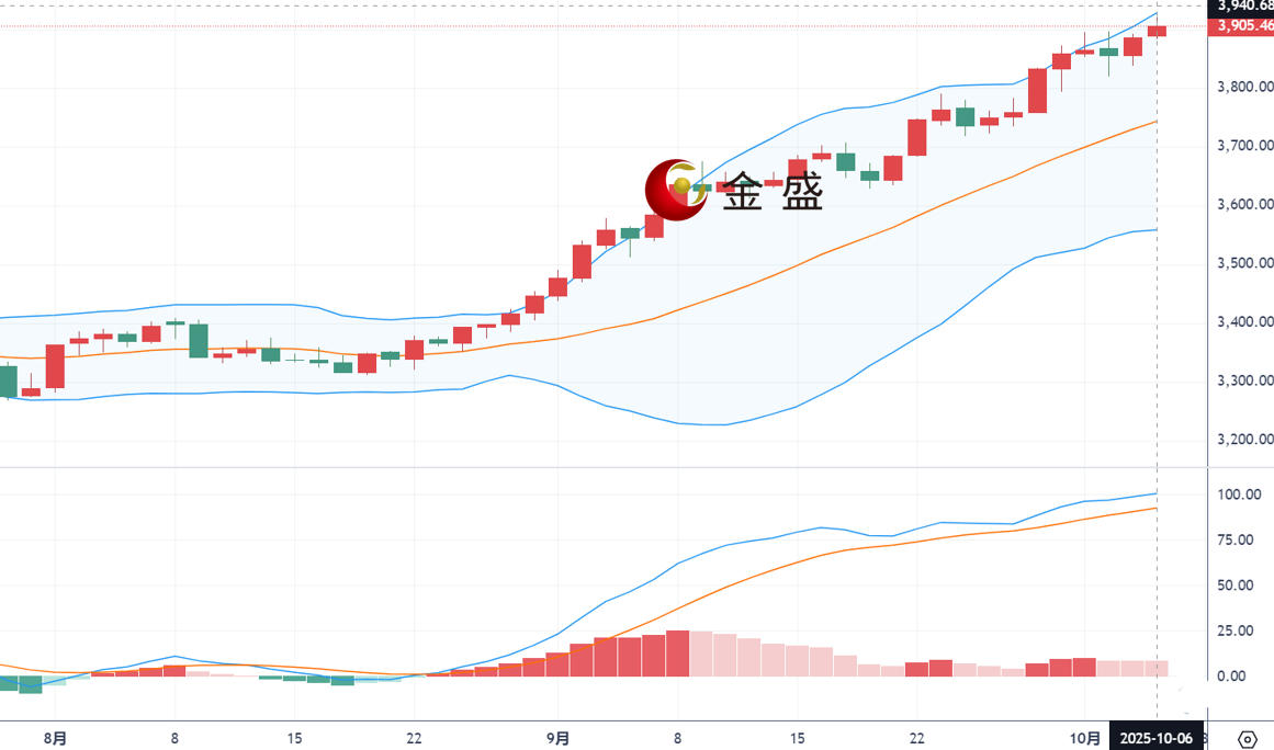 现货黄金上一交易日多头再度发力,日线再次收阳。今日黄金早盘大幅走高,最高到了3920附近再创历史新高,随后遇阻回撤,整体走强趋势未有减弱迹象,布林带开口,早盘行情冲高谨防大幅回落,但没出现明确回落信号之前,操作上建议低多为主;短期关注3900附近有效得失,下破进一步关注3880-3870区间支撑,一旦站稳3900一线,黄金料将逐步走高,进一步测试4000关口。