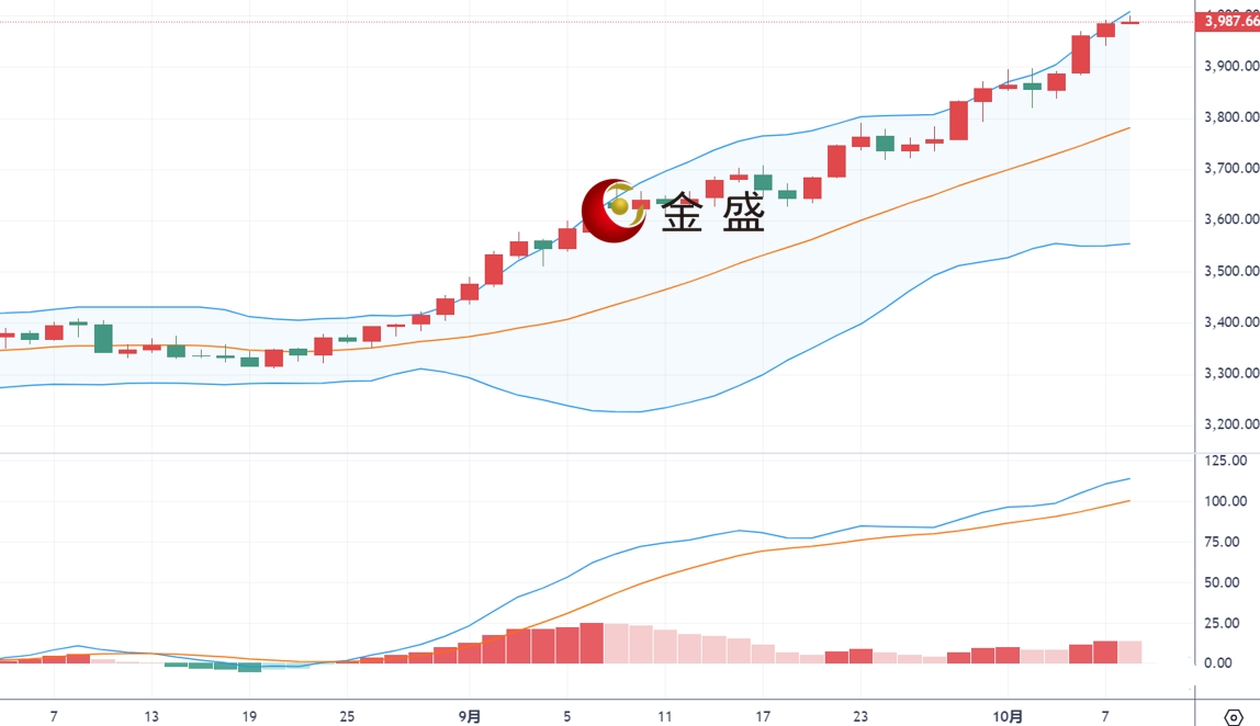 现货黄金上一交易日早盘高开高走,午后维持震荡蓄势,欧盘回踩3940一线获得支撑后重启涨势,再次刷新历史高点至3991附近,日线收阳线走破位多头上涨。今日早间开盘震荡攀升走高3990之上,一度突破4000.00美元/盎司关口,整体趋势走势依然偏多。K线组合呈多头排列,目前价格仍处于受市场避险情绪提振的上行周期,操作思路低多为主;上方关注4010-4020区间阻力,下方关注3950-3940区间支撑。