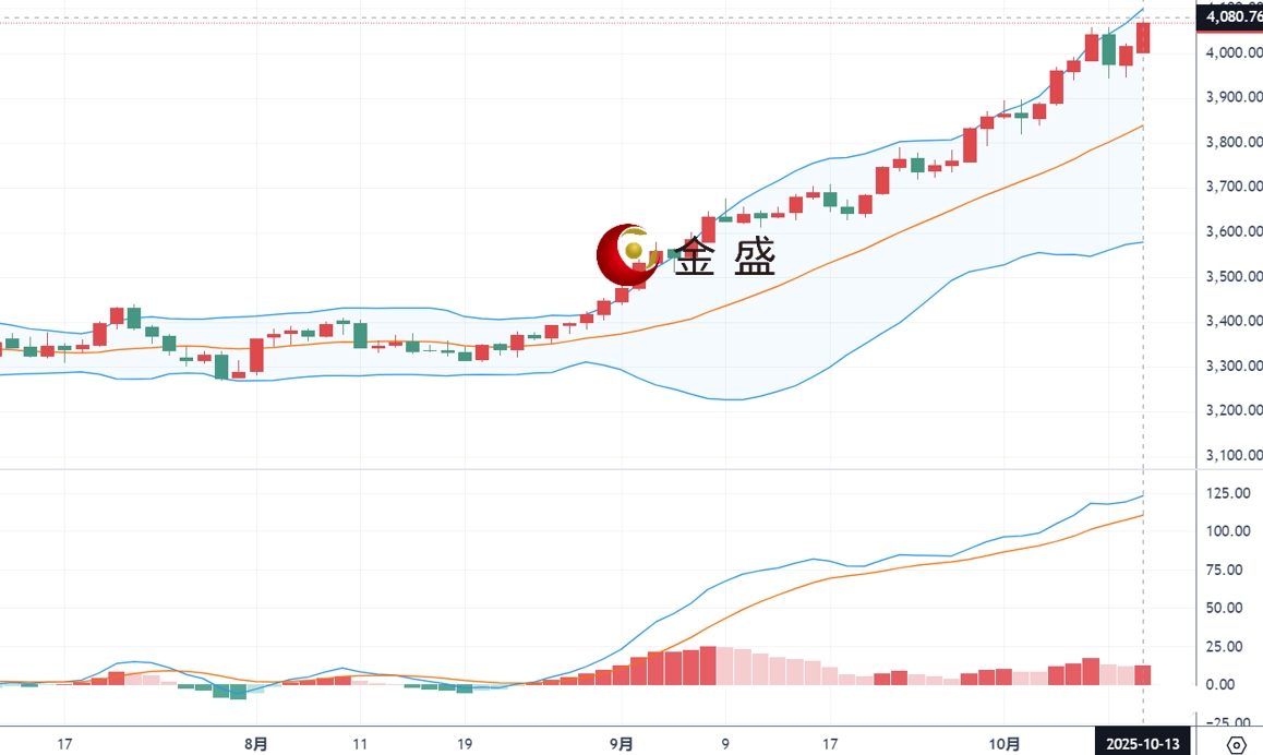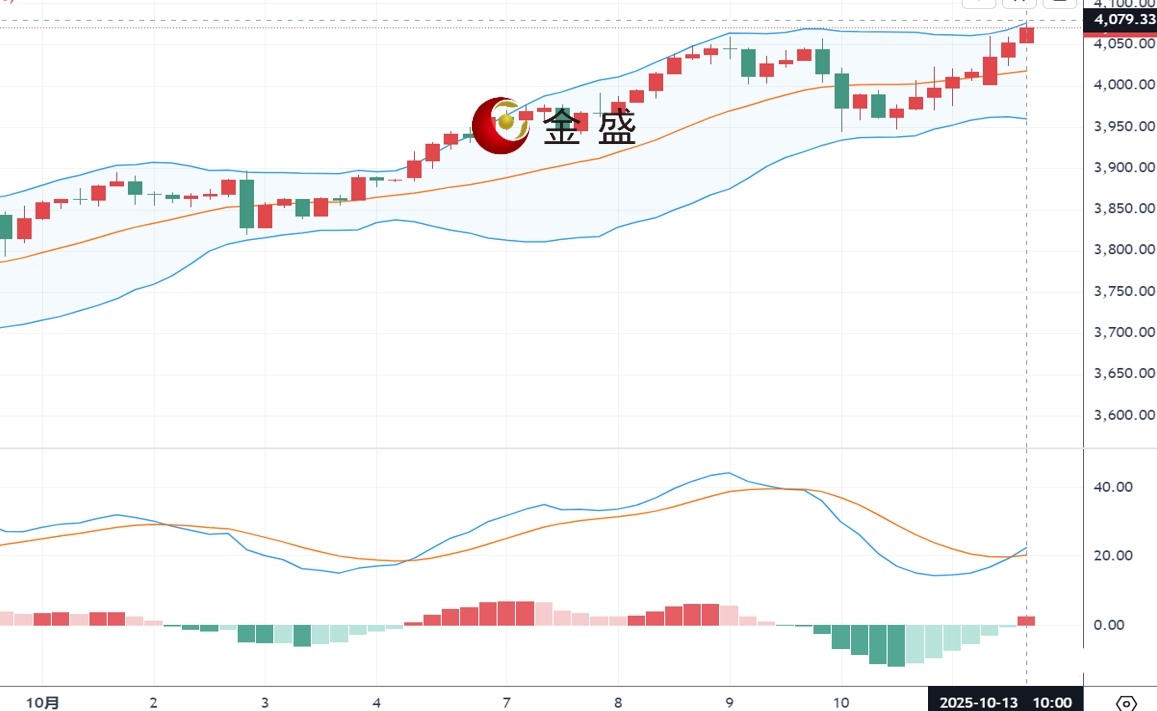 从日线图来看,现货黄金上一交易日触底反弹重返高位整理走势,日线收带长下影线阳线。今日黄金早盘突破4060美元/盎司前期压力,创历史新高;午后,金价继续攀升,冲破4070关口最高触及至4079附近续刷新高,MACD金叉且多头动能维持放量,整体多头方向未发生改变,日内继续看涨思路。