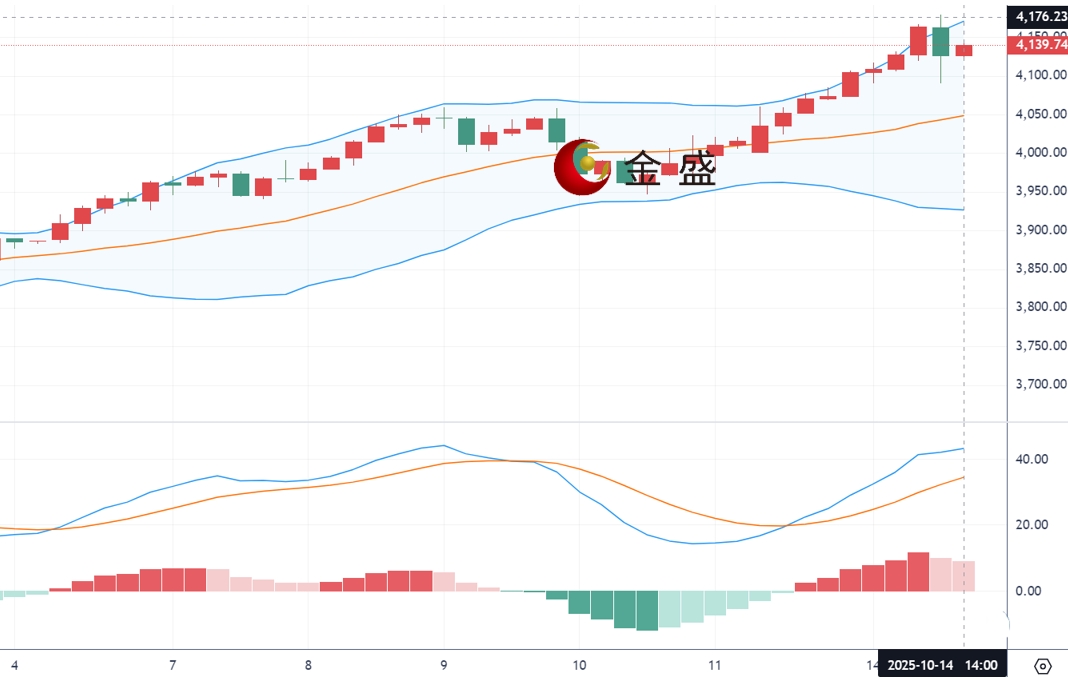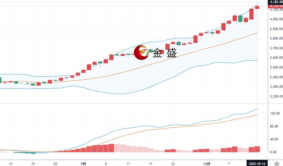 从日线图来看,现货黄金上一交易日继续强势收阳,突破4060关口后开启放量上涨,美盘最高触及到了4116附近位置,日线连阳强势升高,短线伴随回调震荡再走高。今日早盘环境延续上涨,持续突破新高,午后直接高台跳水,从4180区域直接跳下去,扫荡式下跌,加速跌至4090区域,行情目前继续运行在布林带上轨附近,多头动力持稳,未有明显减弱迹象,操作上依然还是偏看涨为主。