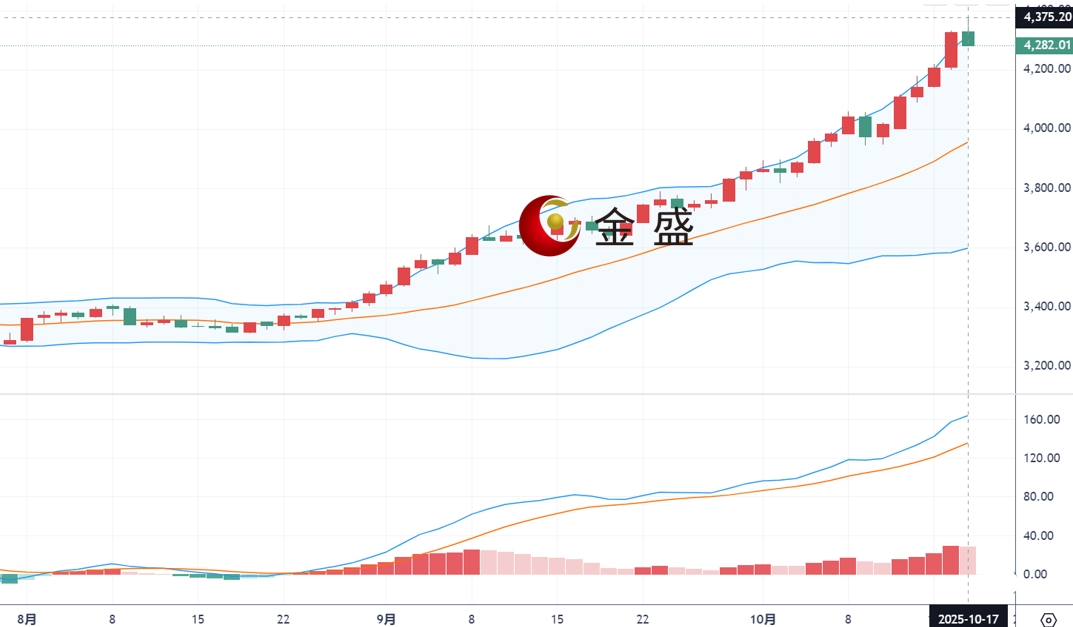 现货黄金隔日连续第四个交易日创新高,飙升至每盎司4300 美元以上,因贸易紧张局势加剧以及美国政府停摆,投资者纷纷涌向黄金避险,而降息预期进一步助推了这一势头。交易员目前押注美联储将在10月降息25个基点,12月再降息一次,概率分别为98%和95%。在低利率环境下,黄金这种无收益资产通常表现良好。截至目前,现货黄金继续冲高,最高触及4378.93美元/盎司,最低至4261.39美元/盎司。