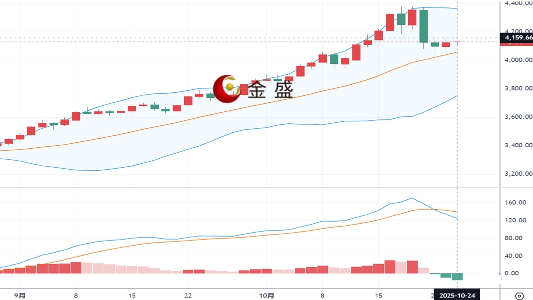 现货黄金上一交易日早盘开盘先回落,日线最低触及4065的位置后行情强势拉升,最高触及到了4154的位置后行情尾盘回落,日线最终以一根上下影线等长的中阳线收线。黄金震荡收涨,稳于布林带中轨支撑上方,MACD指标形成死叉,技术面显示黄金存在继续调整的需求。黄金触底反弹后,逐渐止跌企稳,保持震荡走势运行,价格暂时在4160一带承压,操作上建议高空低多交易思路。上方关注4160-4180区间阻力,下方关注4050-4030区间支撑。