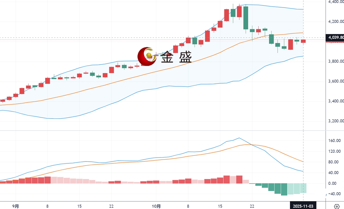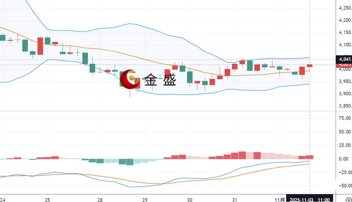 从四小时图来看,现货黄金上一交易日再次呈现冲高暴跌态势,今日早盘黄金跳空低开后虽出现短暂反弹,但价格未能突破关键压力位,整体维持震荡格局。当前macd金叉缩量震荡,布林带三轨放平,价格重心有所回升,但多头动能有限。虽然反弹力度不够,短线趋势上也形成了一个上升趋势,操作上建议以回踩低多为主,上方关注4230-4240区间阻力,下方关注3960-3950区间支撑。