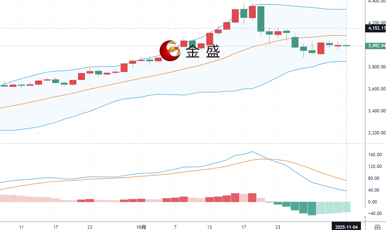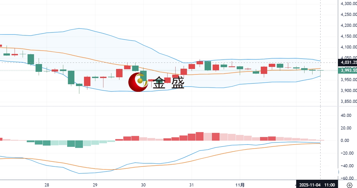从四小时图来看,现货黄金上一交易日顺势反抽至4030上方,承压二次回落,最低回撤3995支撑线,最终形成慢跌连阴的局面。今日开盘黄金失守4000关口,短线在整理中有进一步的回调趋势,价格暂时围绕布林道上轨与下轨之间收缩震荡,MACD多头动能已经减弱,且双线运行于零轴下方,布林带收口,短线可能还会伴随迂回反复,继续关注上方4030-4035区间压制,反弹不破继续做空,下方关注3960-3950区间支撑。