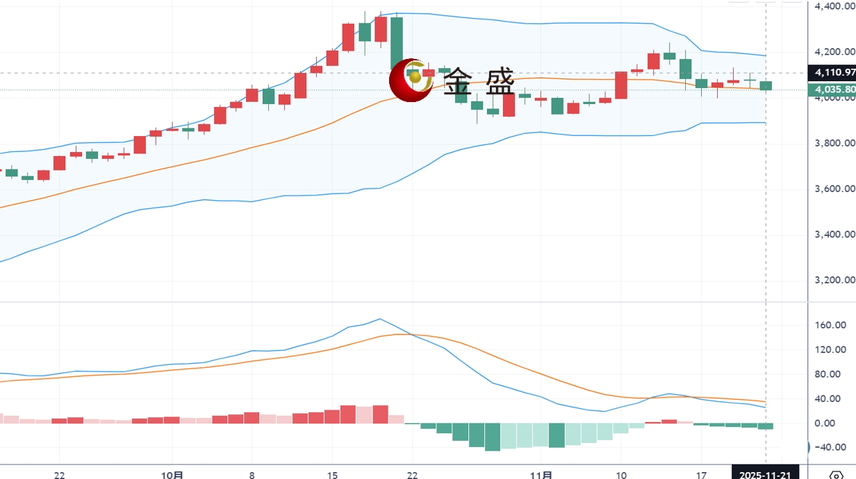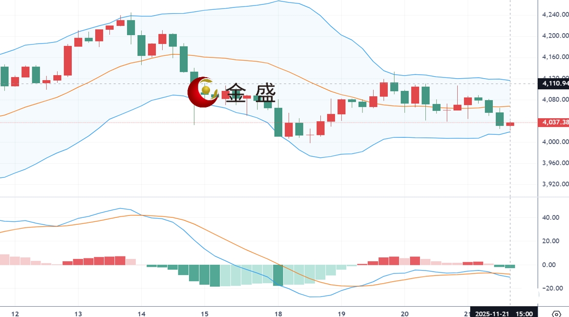 从四小时图来看,现货黄金上一交易日美盘反抽至4110高点承压后震荡再度走低,该区域目前仍然成为重要的阻力区域。今日黄金延续弱势偏空击穿隔日低点,K线围绕中轨反复迂回,上行动能放缓,布林带目前收缩整理当中,黄金反弹高点依次降低,短线整体趋势震荡偏弱,操作上建议高抛低吸,上方关注4100-4110区间阻力,下方关注4010-4000区间支撑。