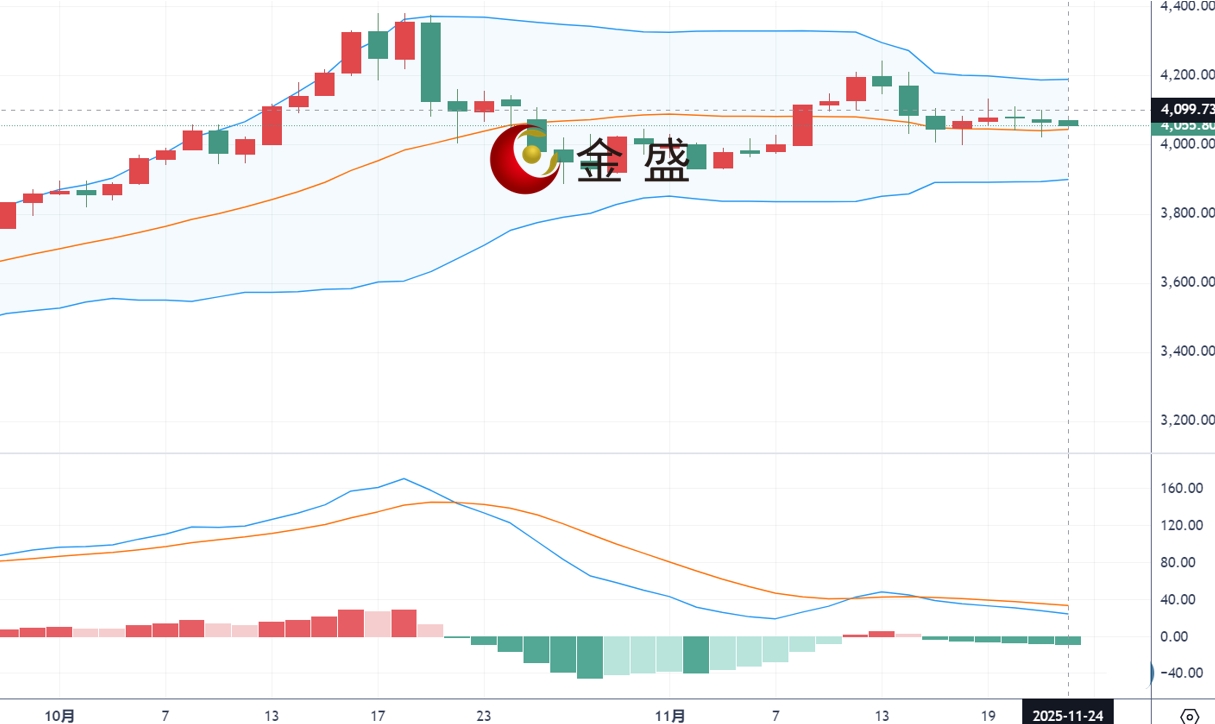 现货黄金上一交易日早间开盘后小幅度回撤,最低触及4022一线后反弹,美盘时黄金震荡回升,美盘开盘后继续上涨,最高涨至4101美元遇阻,日线再次收十字星。黄金温和反弹遇阻后,走势继续保持区间震荡运行。4110依然是短期黄金反弹的重要阻力,布林带横向运行,MACD指标死叉,技术面显示空方仍占优势,操作上继续逢高空为主,上方关注4010-4020区间阻力,下方关注4020-4010区间支撑。