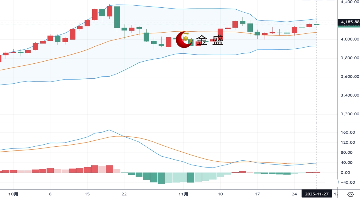 现货黄金隔日延续涨势,攀升至逾一周高位,受市场对美联储将在下月降息的预期提振。市场对美联储12月降息的预期持续升温,成为推动金价上涨的关键因素。根据CME FedWatch工具显示,交易商认为美联储下月降息的可能性已达85%,远高于一周前的30%。截至目前,现货黄金窄幅震荡,最高触及4171.4美元/盎司,最低至4148.73美元/盎司。