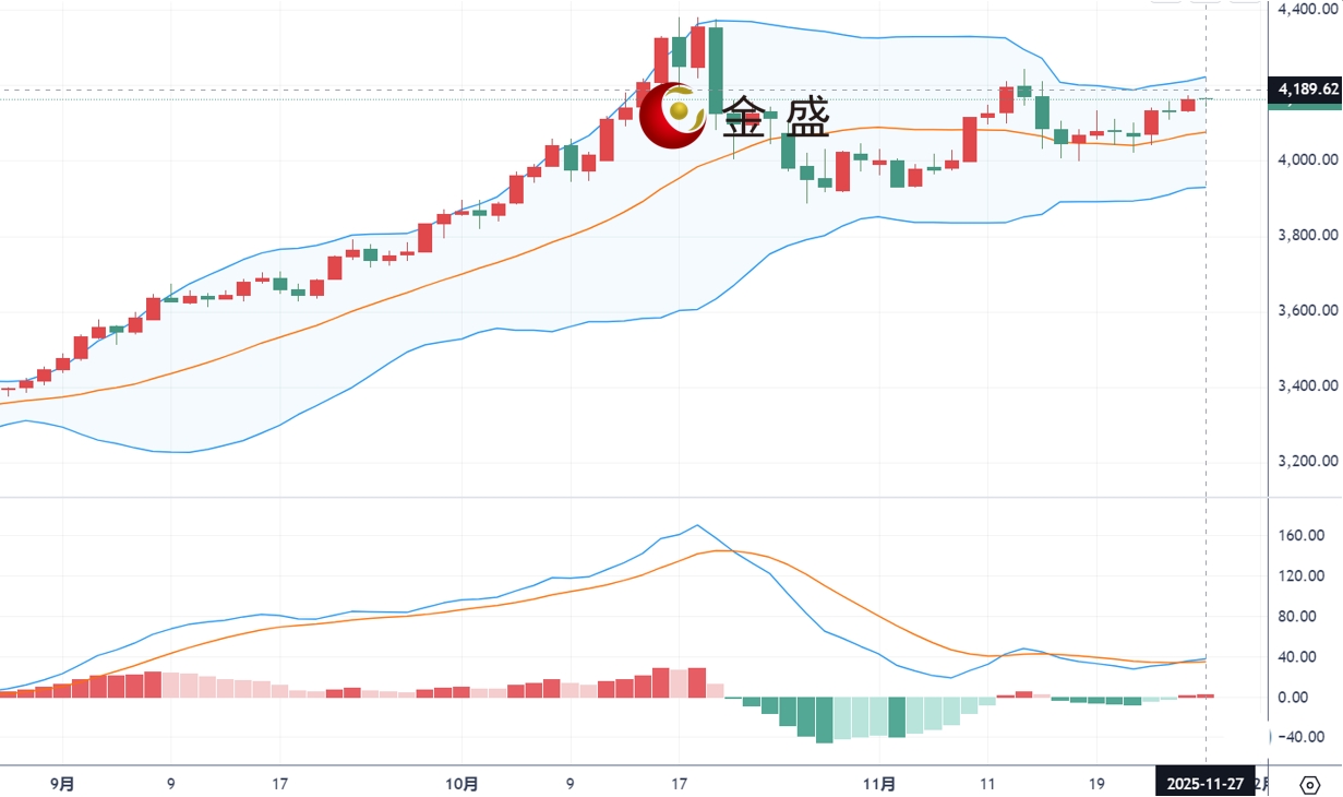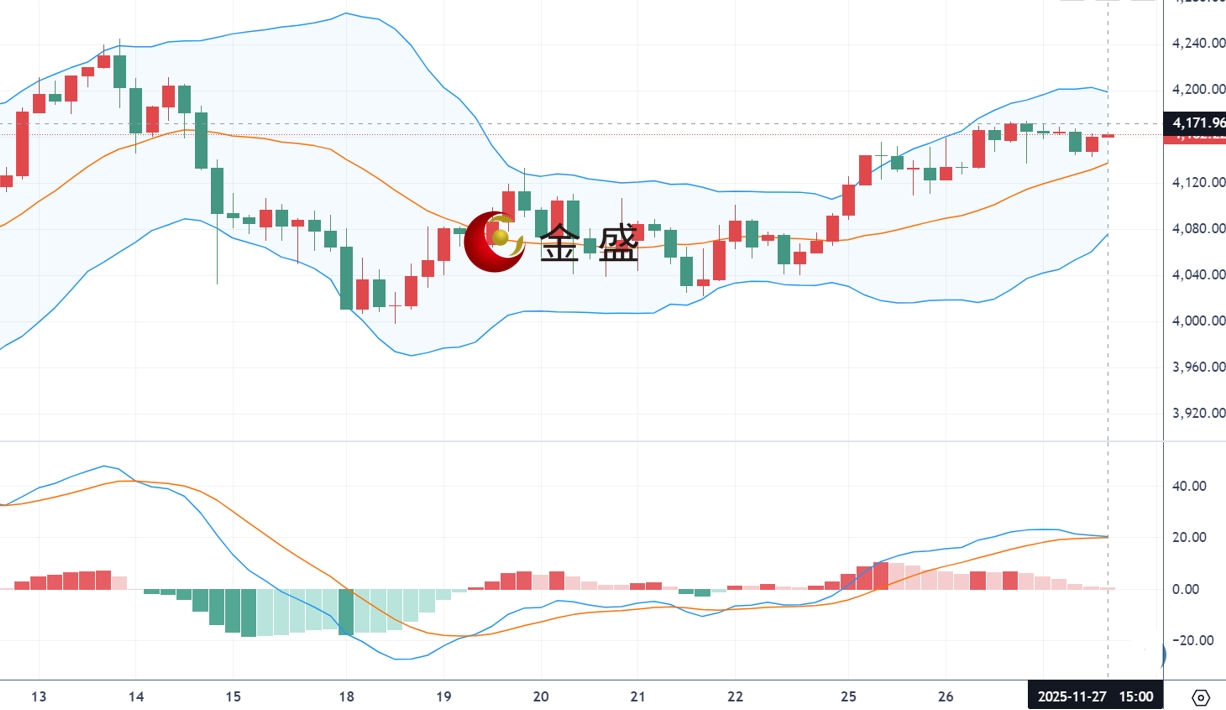 从四小时图来看,现货黄金上一交易日刷新逾一周高位,盘中一度触及4173美元的峰值。黄金目前运行于4120-4180的区间震荡格局,价格企稳中轨上方,因恰逢美国感恩节,黄金市场将提前休市,市场交投可能受到限制。上方4180附近构成强劲阻力,美盘休市,预计波动不大,尽量保持观望。下方继续关注昨日低点区域4135一带,有效破位继续关注4100有效得失。