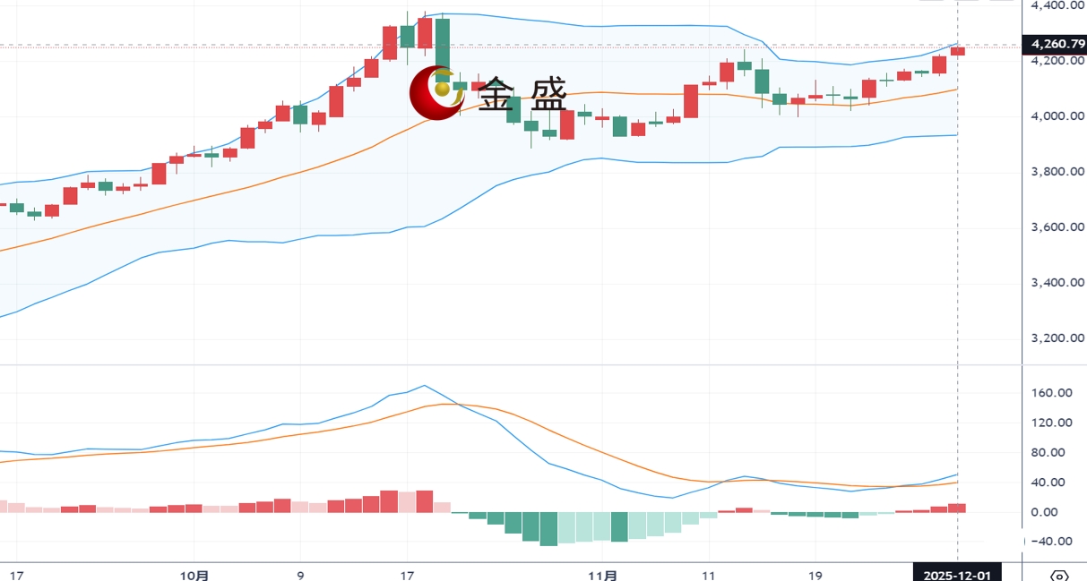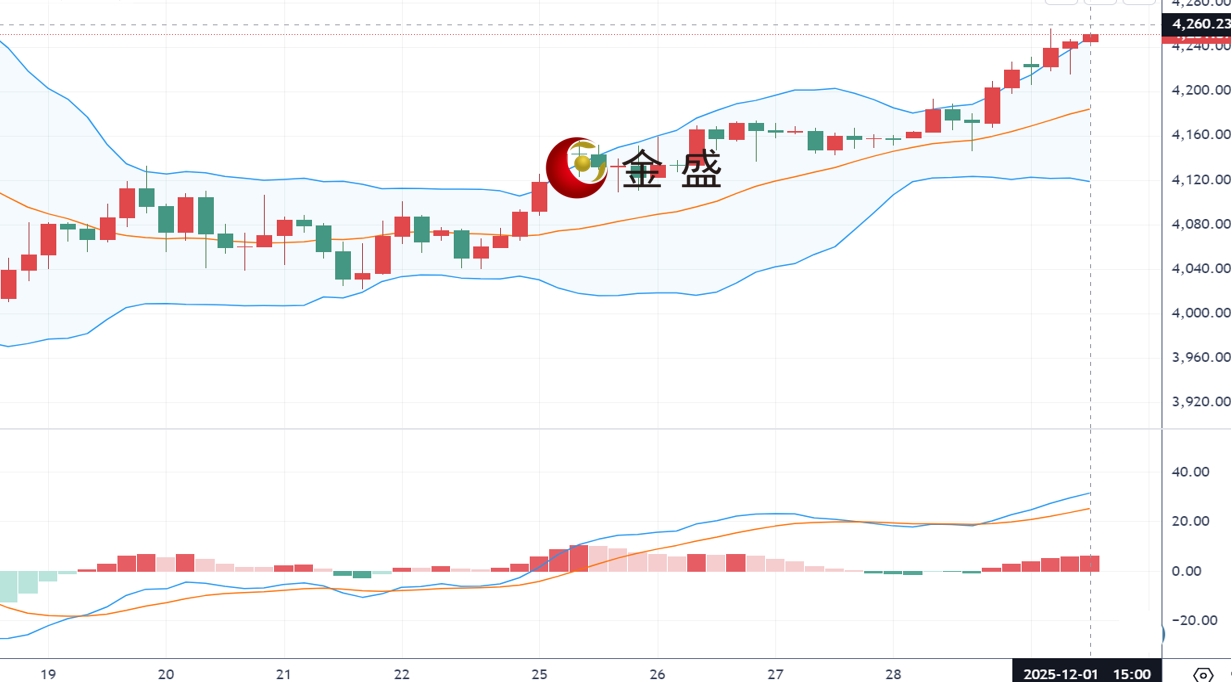 从日线图来看,现货黄金上一交易日强势冲高,触及两周新高4226附近,日线报收一根大阳线。今日周一早盘黄金继续保持涨势,一度刷新高点4256附近,K线组合呈多头排列,预期后市将延续放能。布林带开口,指标macd金叉放量运行,黄金目前在日线走势上价格突破前期的联排压力带之后,K线继续沿着短周期均线维持较好的震荡上行走势,短期关注4260-4270区间阻力。
