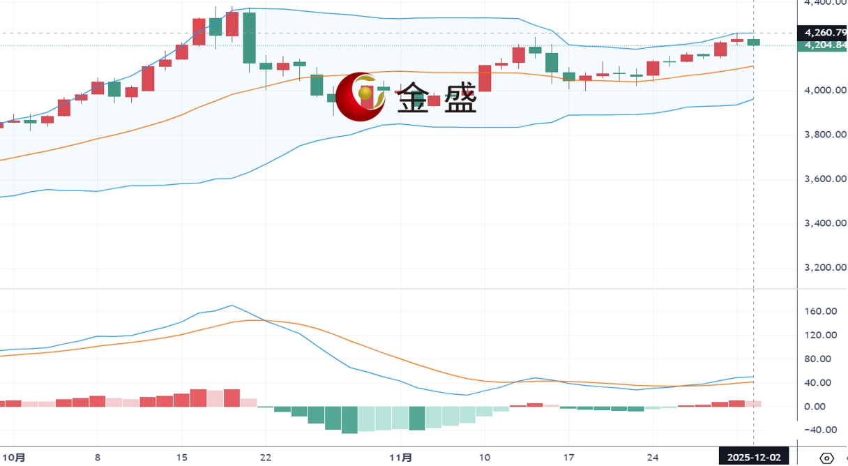 现货黄金隔日升至六周以来最高水平,白银价格表现更为强劲,一度逼近59美元大关,最终收涨,今年以来,白银价格累计涨幅已超过100%。对美联储进一步降息的预期是支撑贵金属价格的核心因素。当前交易员预计美联储在12月会议上降息的概率已升至87%。截至目前,现货黄金窄幅震荡,最高触及4244.41美元/盎司,最低至4199.44美元/盎司。