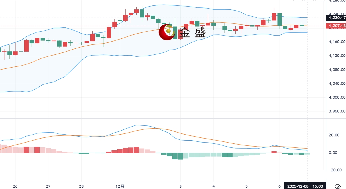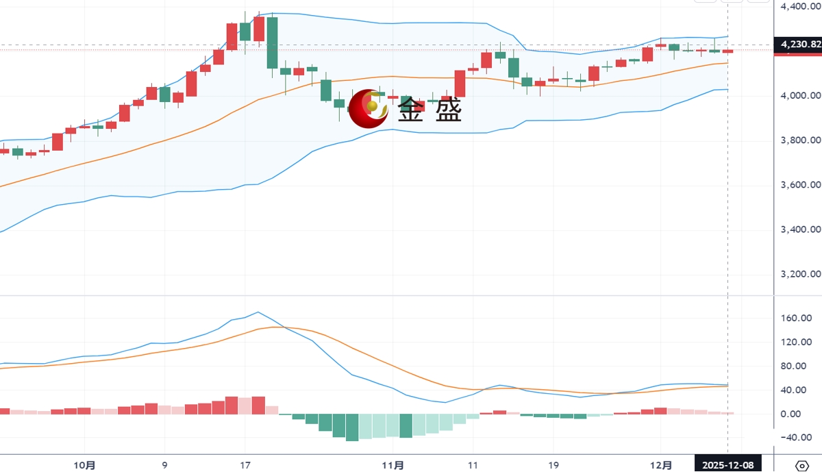 从日线图来看,现货黄金上一交易日向上突破4230美元附近的短期关键压制,刷新日高至4259美元遇阻后短线急跌,失守4230美元后迅速跳水至4198美元企稳,最终收倒锤阴线。MACD指标金叉轻微向下,短期技术面显示黄金仍处于震荡整理阶段。黄金尽管冲高遇阻,但受多重利好支撑,短线上涨动力存在,但上方空间仍有限。