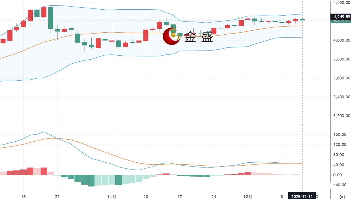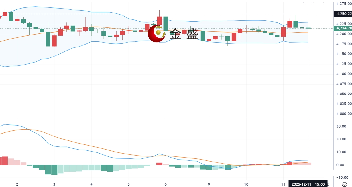 从四小时图来看,现货黄金上一交易日在决议后短线快速拉升,最高触及4238美元/盎司上方。今日黄金未能延续涨势,自高点回落并转为下跌。k线运行中轨上方,MACD零轴附近金叉缩量震荡,美联储降息落地,且利好支撑短期金价走高。黄金近期突破上行区间并稳站在4200美元上方,多头结构明显增强,操作上看涨不追涨,回踩做多为主,下方关注4170美元关键支撑,一旦跌破则短期结构可能转弱,需警惕进一步回调风险。
