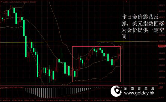 前一交易日现货黄金开盘1207.96美元/盎司,最高1217.47美元/盎司,最低1205.43美元/盎司,收盘1213.96美元/盎司,收盘上涨4.9美元,涨幅0.41%。日内来看,金价早盘开始即呈现震荡上涨的局面,晚间虽有回落但又再次拉升。虽然消息面仍不利多,但美元指数回落为金价反弹带来空间。