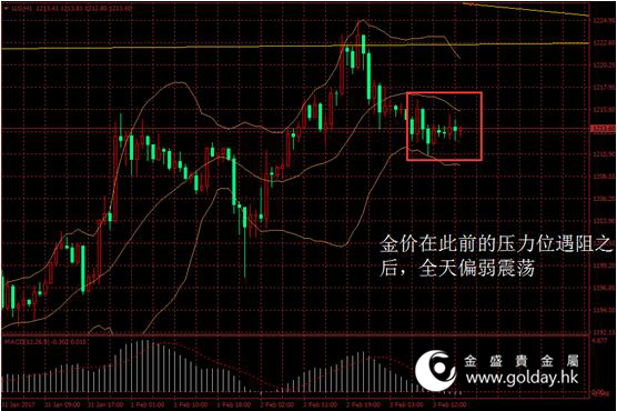今日现货黄金开盘1215.61美元/盎司,截至北京时间下午5点30分,最高价格为1216.67美元/盎司,最低价格为1210.82美元/盎司。日内来看,金价在此前的压力位遇阻之后,全天偏弱震荡,美元指数略有走强,消息面变动不大,非农数据公布前市场交投较为谨慎。
