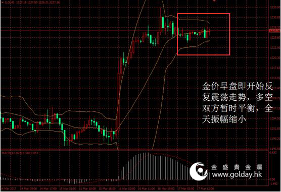 今日现货黄金开盘1226.14美元/盎司,截至北京时间下午5点30分,最高价格为1228.42美元/盎司,最低价格为1224.34美元/盎司。日内来看,金价早盘即开始反复震荡走势,多空双方暂时平衡,全天振幅缩小。美元指数变化也有限,消息面保持平静。