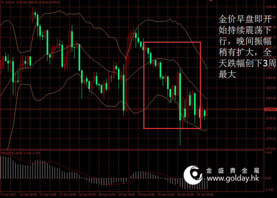 上一交易日现货黄金开盘1289.28美元/盎司,最高1290.58美元/盎司,最低1274.11美元/盎司,收盘1279.64美元/盎司,收盘下跌9.69美元,跌幅0.75%。日内来看,金价早盘即开始持续震荡下行,晚间振幅稍有扩大,全天跌幅创下3周最大。美元指数的反弹对金价造成压力,消息面影响不明显。