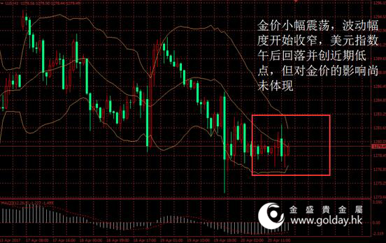 今日现货黄金开盘1289.28美元/盎司,截至北京时间下午5点40分,最高价格为1290.58美元/盎司,最低价格为1280.77美元/盎司。日内来看,金价小幅震荡,波动幅度开始收窄,美元指数午后回落并创近期低点,但对金价的影响尚未体现。消息面则变动不大。